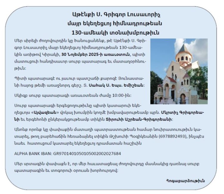 Աթէնքի Ս. Գրիգոր Լուսաւորիչ մայր եկեղեցւոյ հիմնադրութեան 130-աﬔակի տօնախմբութիւն
