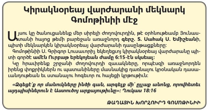 Կիրակնօրեայ վարժարանի մեկնարկ Գոմոթինիի մէջ